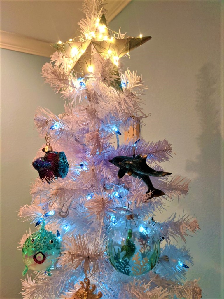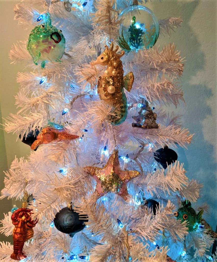 This is a monumental and challenging year especially now at Christmas. But we can’t let this virus and fear define us. We can still wave at a distance, give lots of air hugs, and remember we all have many things to be thankful for. Do I make light of the situation we are in as a world people, by no means. I spent my concerning time in quarantine, I am fully aware of the danger, the risks and the possible outcomes. At my age it is even more dangerous but I refuse to not shine my light of love and kindness in the ways that I can that are safe. This year in defiance of being shut up inside, I decorated two weeks earlier and added another tree…in my bathroom. That brings me to 4 trees. Since my bathroom has a beach theme, so does the tree. So I have posted my pictures below and hope you enjoy with a smile. Do we need to be careful, yes, but do we need to be sad, no, disappointed, yes but this hopefully won’t last much longer. So spread your cheers through the cyber ways, enjoy this wonderful season and always be kind.