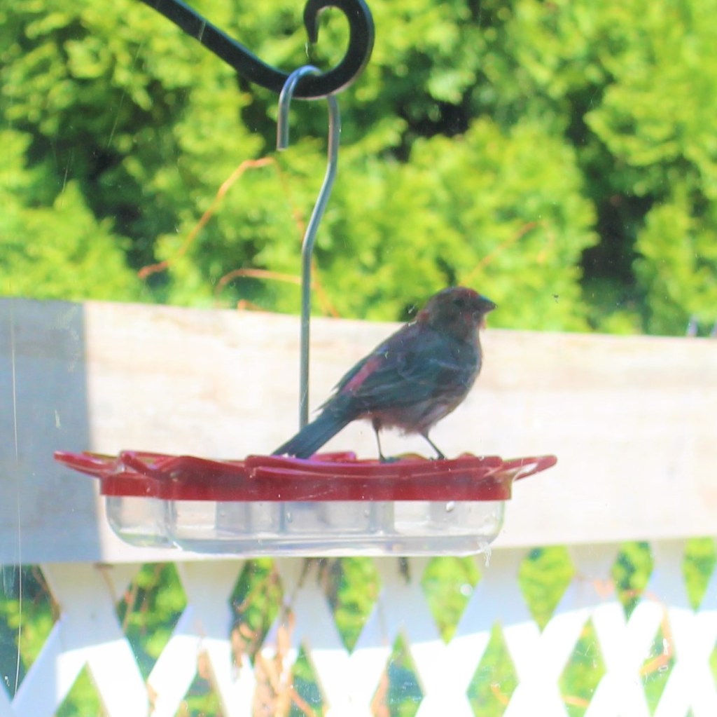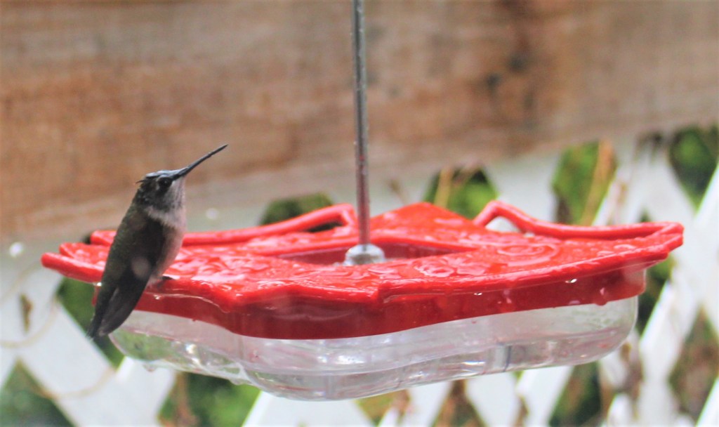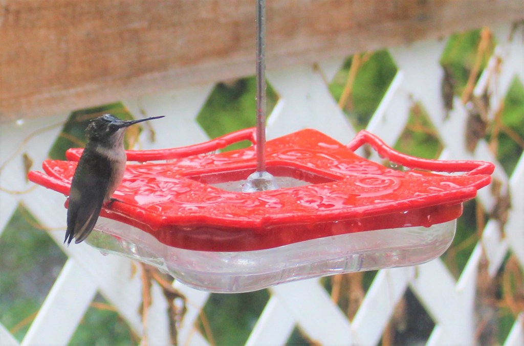 The birds that were the most fascinating on this rainy day were the hummers. They were unfazed by the rain, sitting out on top of the other feeder hooks as it rained down on top of them with only occasional shaking of their feathers. My hummingbird feeder hangs under the eaves of the house so it is somewhat protected from the rain.