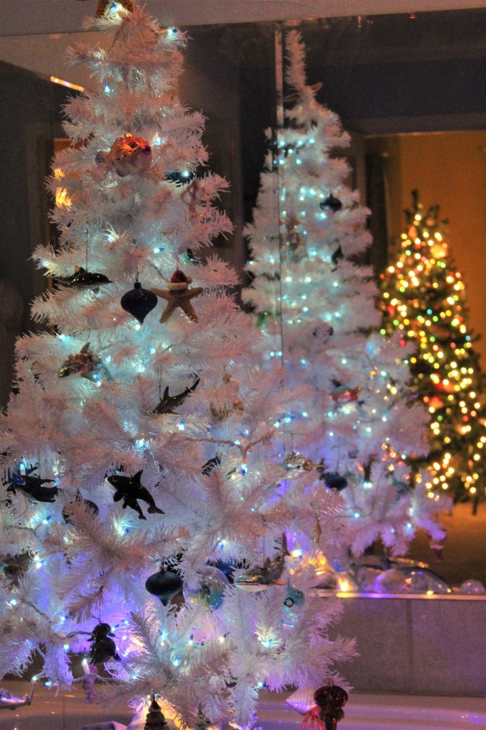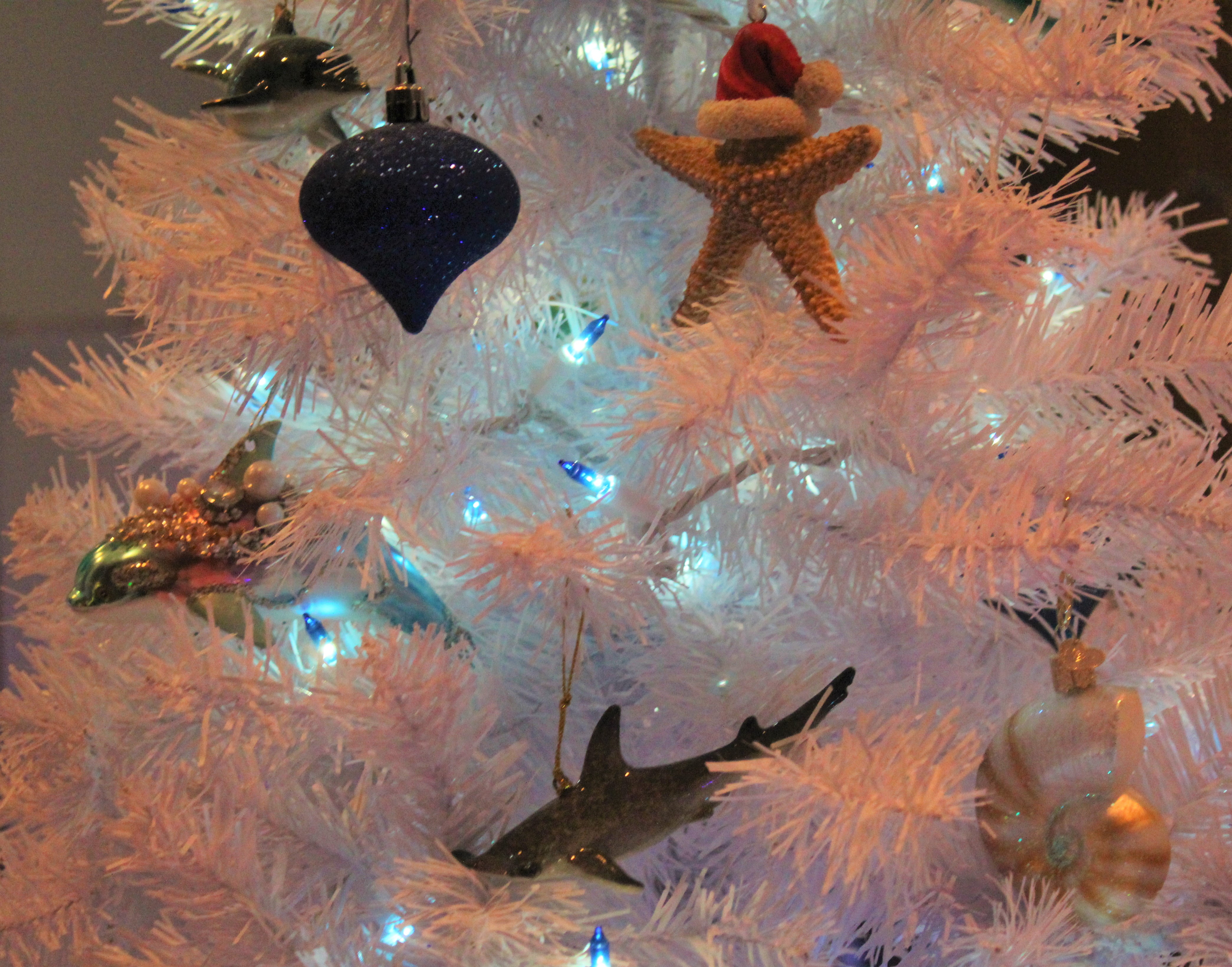 The tree is white and the lights are blue and all ornaments except for a few small dark blue balls, are ocean or river themed. I love this picture because you see the tree, its reflection in the mirror and the reflection of the tree that is in the bedroom. We will do that tree one day soon.