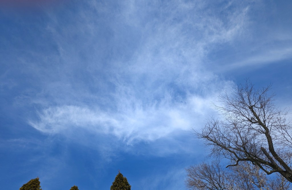 The clouds twisted as they moved across the sky and their colors changed as the sun slowly sets creating a picture of peace and beauty. Even the red bird sang from the top of the tree announcing to everyone who would listen that all is well, the storm has passed.