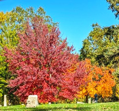 Our cemetery had beautiful hardwoods. These two monuments frame in the beauty of this maple.