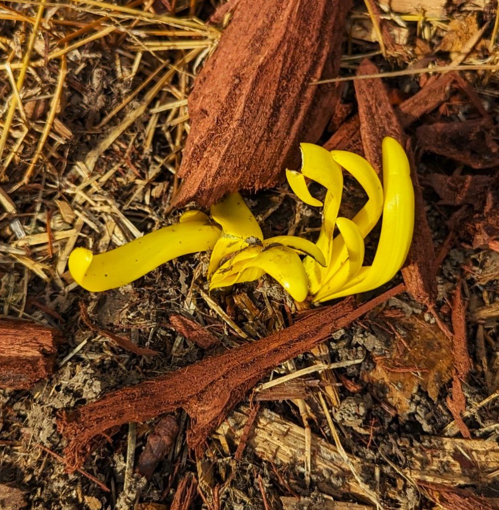 Without the sun, no chlorophyl was made but still the plant pushed through. By this afternoon, it was beginning to stand tall reaching for the sun, broken but alive. Other bulbs coming up in my tard are the crocus as well as other daffodils.
