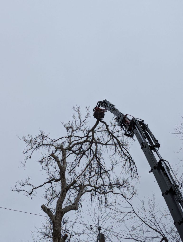 I was awakened this morning, a morning I had hoped to sleep in, but no, loud equipment kept me from being able to do that. As I looked out the window, I saw it was tree-trimming people. I was amazed at how two men were going to take down my neighbors huge sycamore tree. It was a beautiful tree and I had taken many pictures of it during the changes of the seasons. It was easily 100 feet tall and the trunk was close to 10 feet in diameter. Here are pictures of its glory this fall and again last month during the snow.