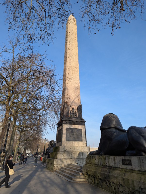 Our goal was to walk down to Cleopatra’s Needle. Cleopatra’s Needle in London is one of a pair of obelisks, together named Cleopatra’s Needles, that were moved from the ruins of the Caesareum of Alexandria, in Egypt, in the 19th century. Inscribed by Thutmose III and later Ramesses II of the Egyptian New Kingdom, the obelisk was moved in 12 BC to Alexandria, where it remained for over 1,800 years.