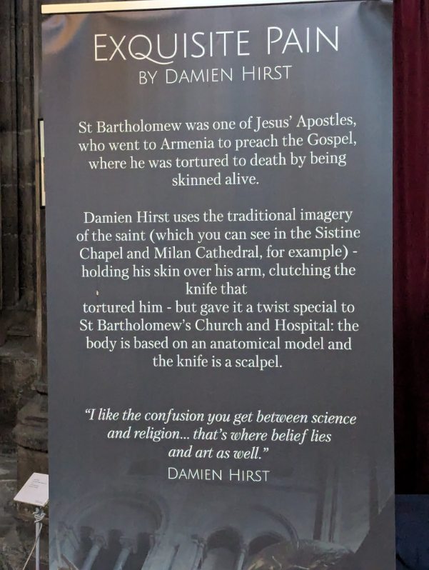 But the beauty of this church was lost on me, even now, because it reminds me of the cruelty of man. An artist, Damien Hirst, created an amazing statue of gold overlay depicting St. Bartholomew’s death as he was skinned alive before being decapitated for preaching Jesus’ love.