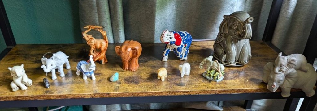 Some memory makers are items that belong to those we love. My mother and I are big collectors of trinkets. Many of her trinkets were Hummel figurines; my trinkets are various animals, including both land and water animals. I even have a Christmas tree that features many animals from the ocean. Below are pictures of a few of my animal trinkets. Elephants have always been special to me, thanks to a memory of a favorite red stuffed elephant that my grandmother gave to me when I was very young.