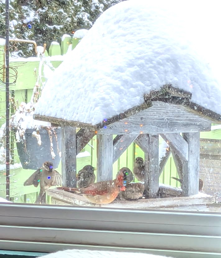 The cardinals are always beautiful when it’s snowing. Their bright red stands out nicely. Most bird pics were taken from inside, so you get a glimpse of my Christmas decor.