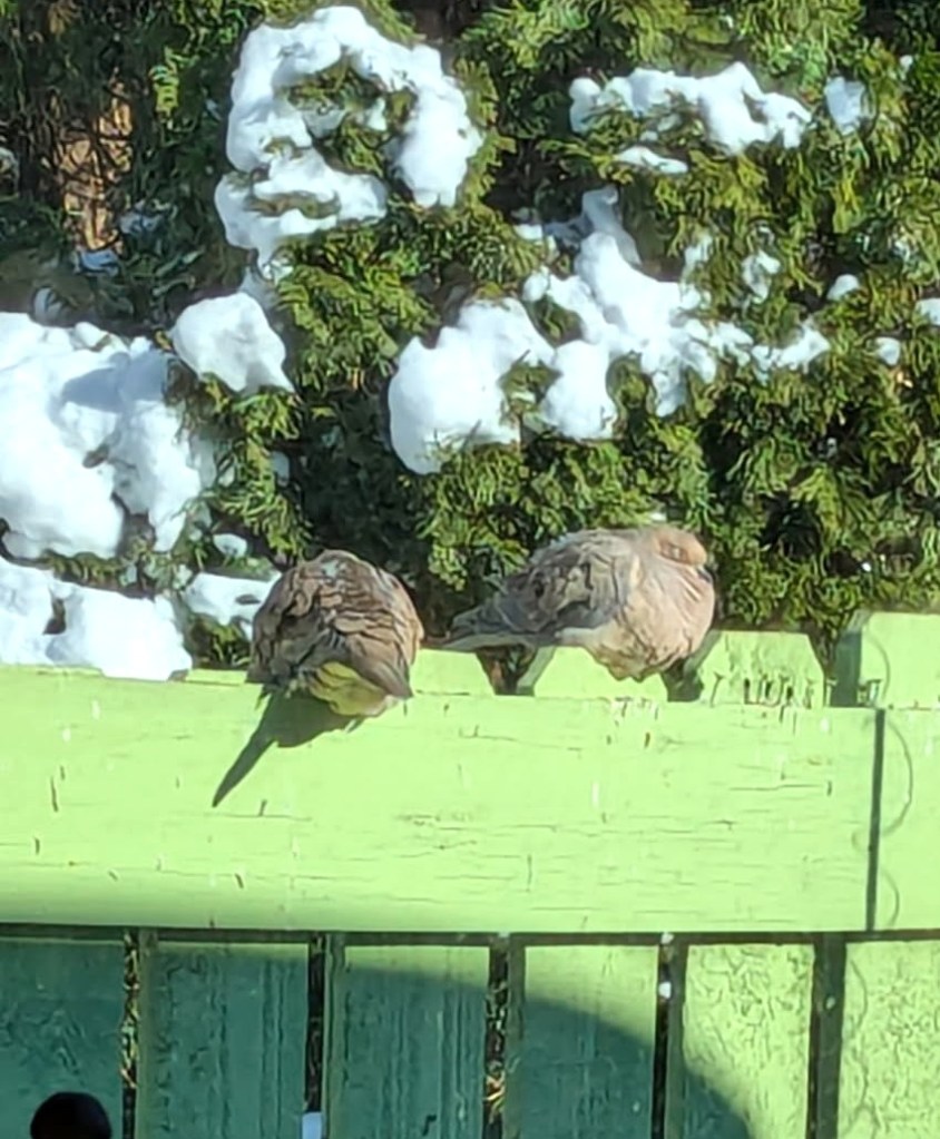 This morning, with the sun shining, it was a beautiful day despite the -1 degree temperature. The mourning doves fluff their feathers for warmth in the sun as they wait their turn to feed.