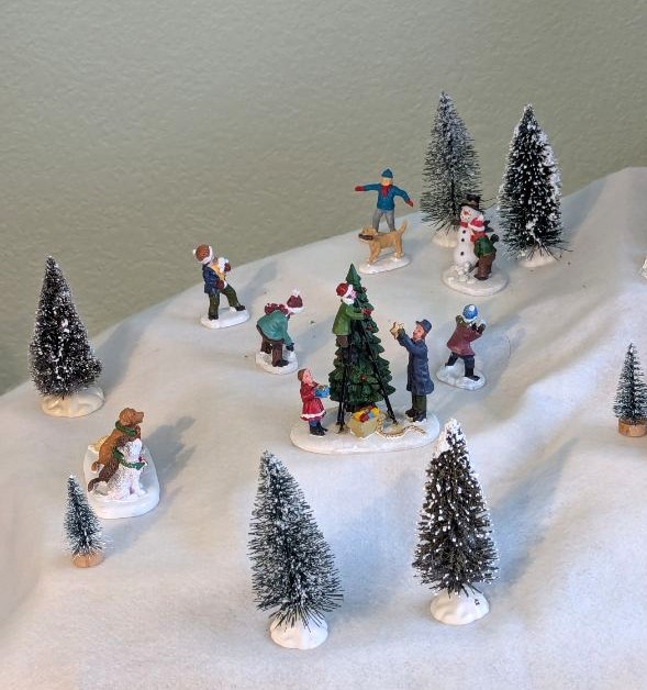 There are several homes of various styles, along with shops such as department stores, a toy store, a clock shop, a candle store, and more. I have several styles of churches besides the large cathedral. A fun house to paint was the rock house, and up the hill from it, some children decorate a Christmas tree while others are having a snowball fight.