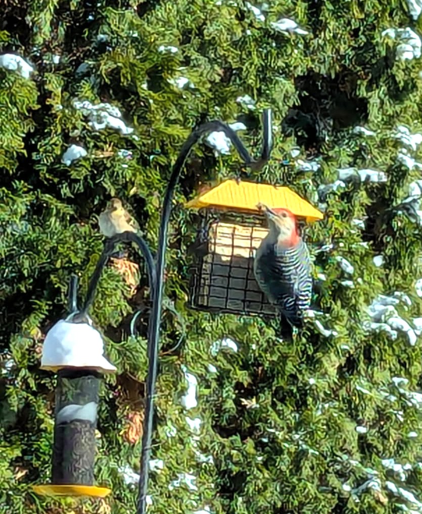 I made sure the feeders were filled before this latest snow came, knowing how spoiled they have become for easy food options. The upper feeder holds suet filled with seeds for energy and needed for warmth.