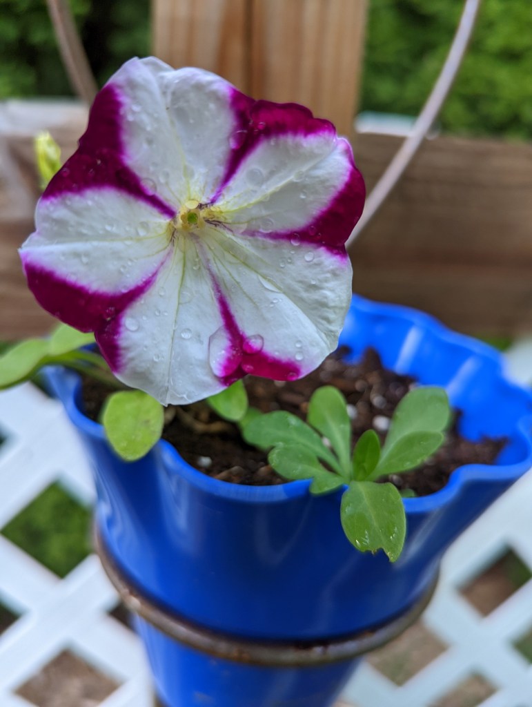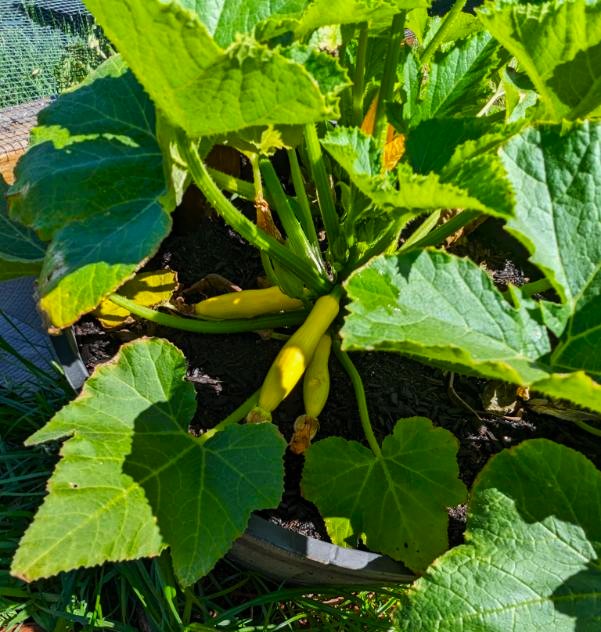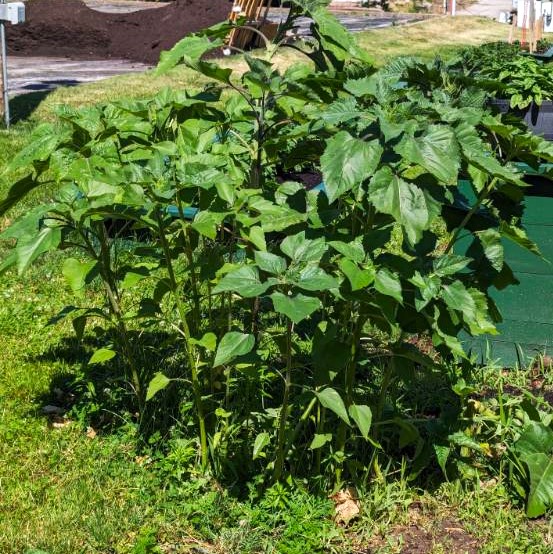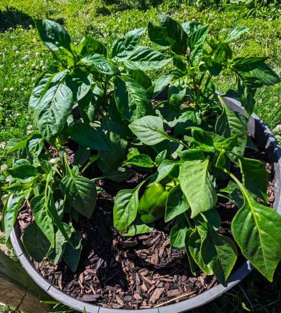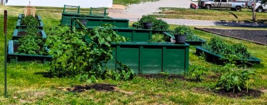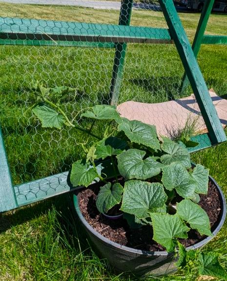 Our cucumbers, squash, and bell pepper are planted in round containers in the center between the high-rise planters. Only one of the high-rise planters is filled and those are our sweet potatoes. We have help coming next week to fill the remaining three high-rise planters and will have to figure out what to plant there.