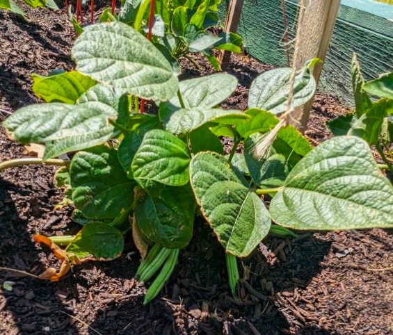 Two of the raised beds on the left-hand side have potatoes – one bed is red potatoes and one is white potatoes. The two beds further down are the green beans and the petite lima beans. They are not doing great because Robins evidently like beans too. But what has survived is flowering and producing. I planted more beans this morning.