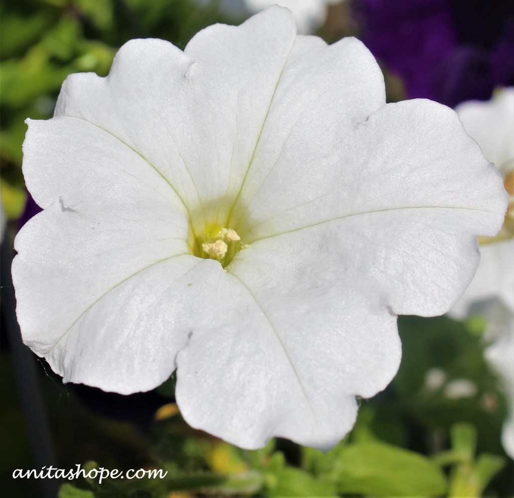 I pulled out my macro lens – still trying to perfect that skill – and inside the bell was what looked to be a bug but after seeing the picture on my computer, I think they are the stamens that are not fully open. I was intrigued by the tiny bristles and the (I presume) pollen dust on the outer petals. And the tiny stripe of purple on the center of the two lower petals also caught my eye when enlarged.